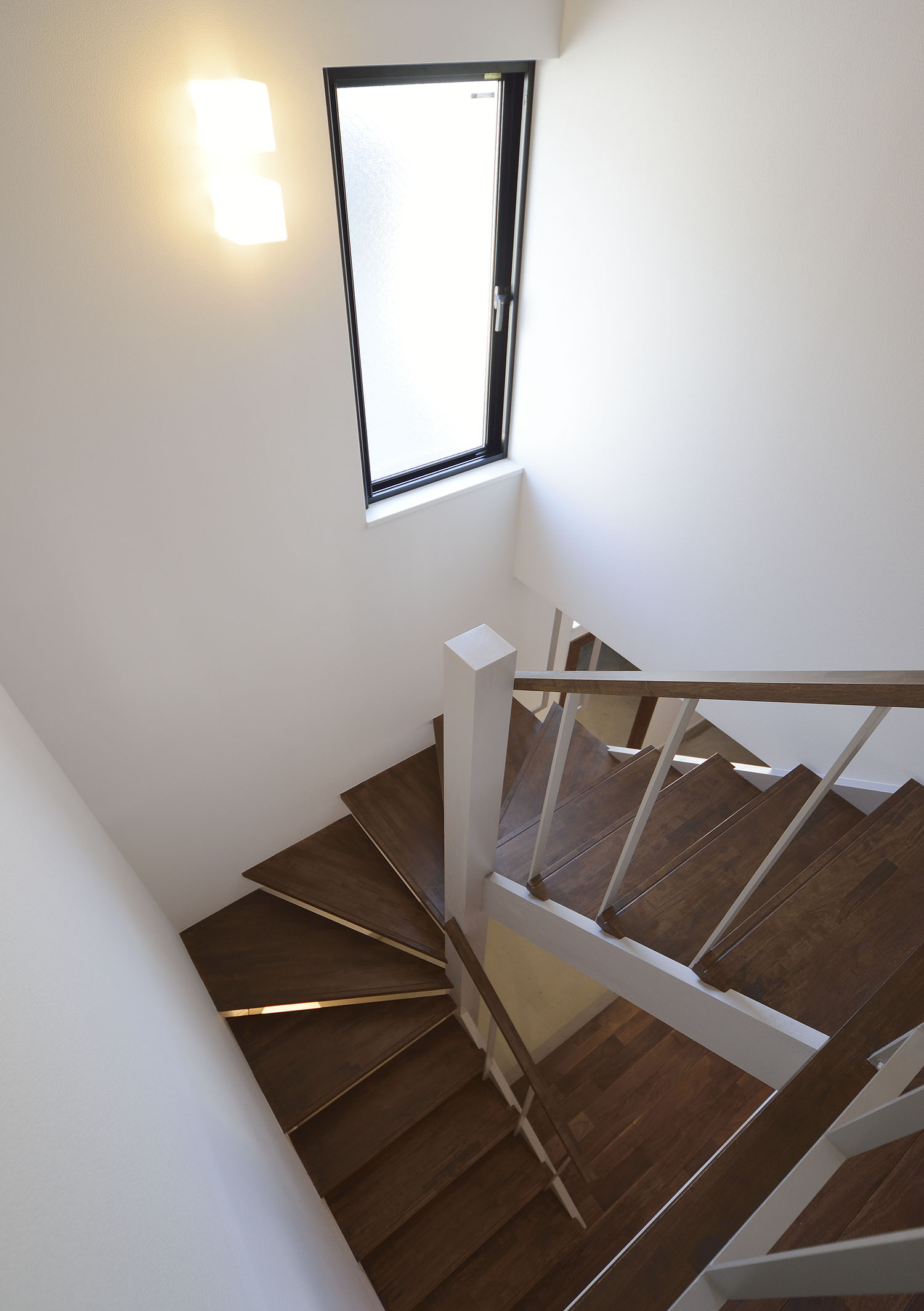 横浜の傾斜地に立地。遠くからでも、家の場所がすぐにわかるようにと、黒い外観の住宅。2階のリビング面積を大きくとるため、オーバーハング構造になっており、外観の特徴になっています。 また、跳ね出した軒天を白くアクセントにすることで全体として、ライトな印象にまとめています。内部空間は外観とは一転させ、白ベースのインテリアに、ウォルナットの床と家具をアクセントに演出した上品な空間になっています。