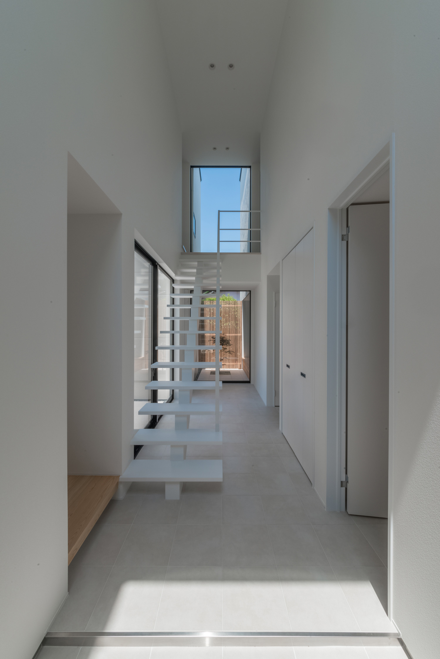 内部を閉ざすように覆う壁や空に伸びる白い壁。 特徴的な外観フォルムが訪れる人の探究心を掻き立てます。 アプローチに導かれてエントランスへ入ると、外部とは対照的に開放的な内部空間が広がります。 内部の大空間には中庭からの太陽光が射し込み、お施主様こだわりの建材が煌きます。 外部・内部がともに明るく輝くような家となりました。