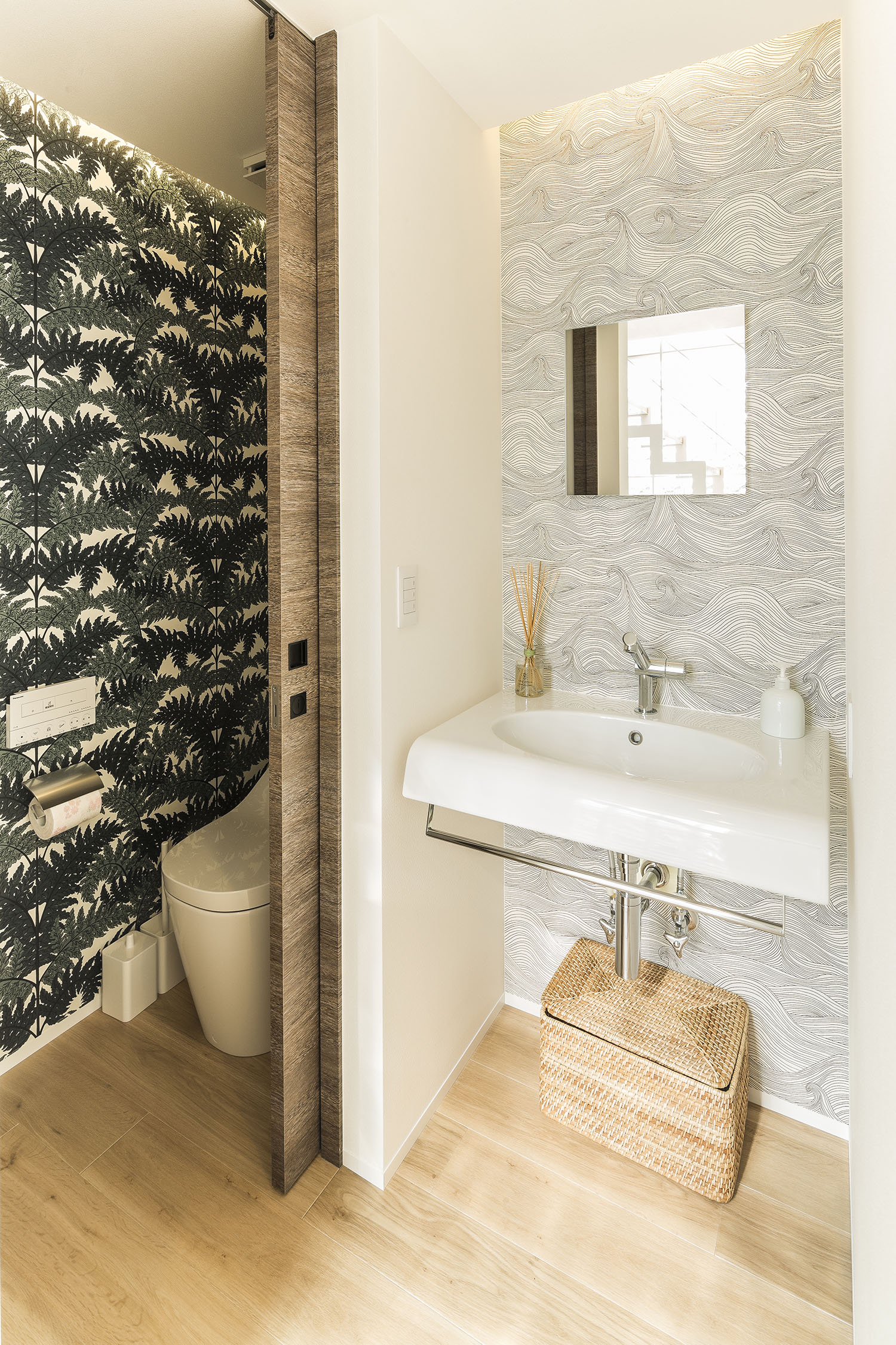 トイレと手洗いカウンターは柄のクロスがアクセントとなります。