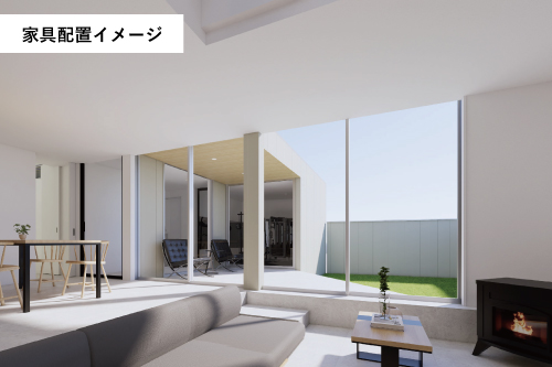 中庭に隣接したLDK。中庭ポーチの高さを室内床と合わせたことで、外部まで一続きに感じることのできる開放的な空間を計画しています。2階へ続く階段の途中にはスキップフロアを設け、上方向へも広々とした空間へ仕上げました。