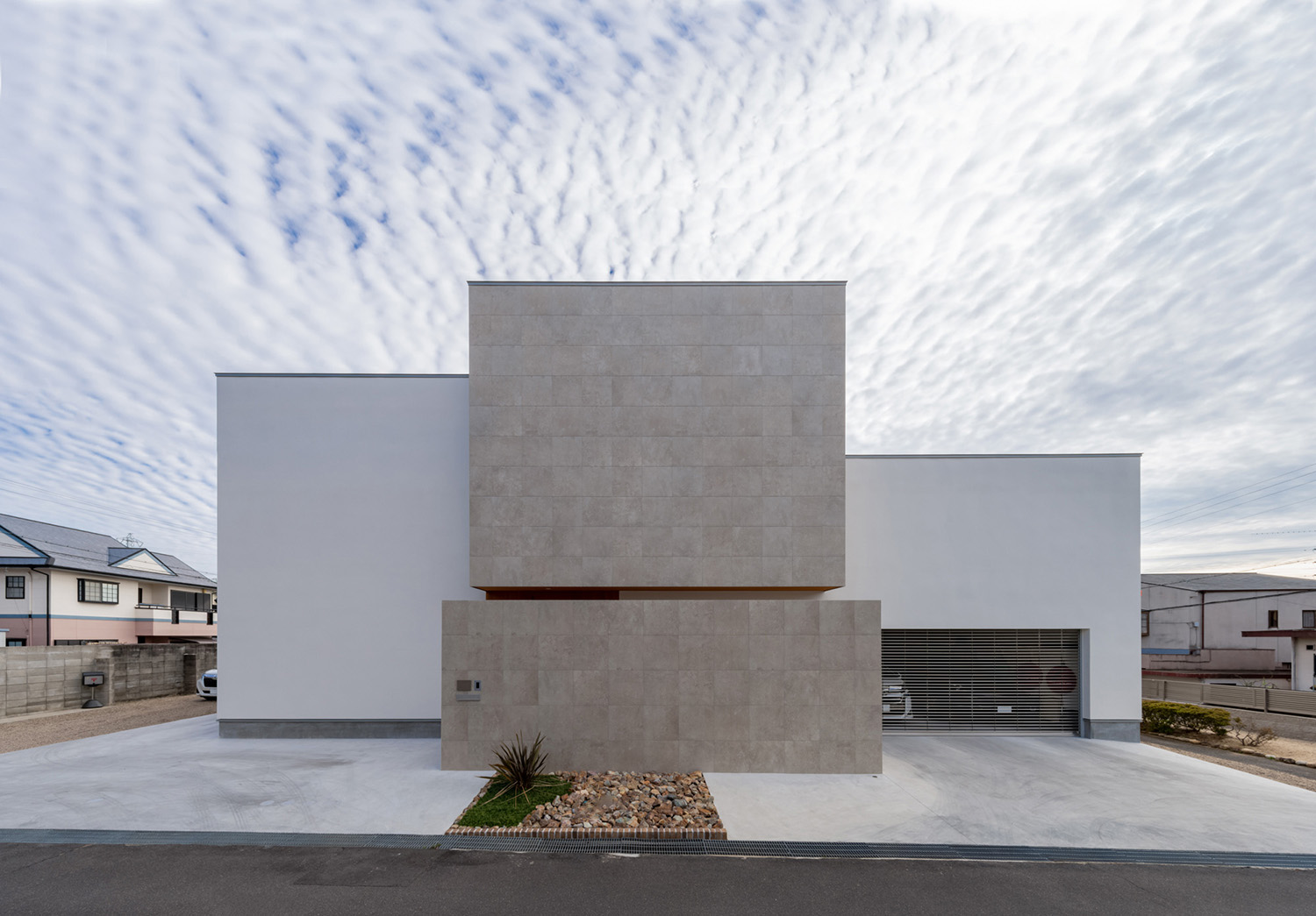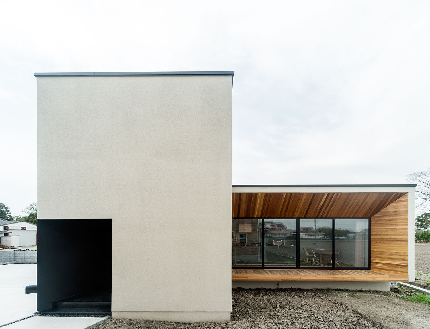 住宅密集地に周辺の景観に馴染む建物ボリュームで計画された平屋住宅。温かみあるグレーの外壁に木のルーバーがアクセントの落ち着いた佇まいの外観に仕上げています。内部は、通り土間や勾配天井、トップライトを設け光と風が自然と抜けていく心地の良い空間に。また、通り土間に面して大開口を設けるなど、視覚的な広さを感じられる豊かな空間に仕上げています。街にfitし、暮らしにfitする、そんな住まいとなりました。