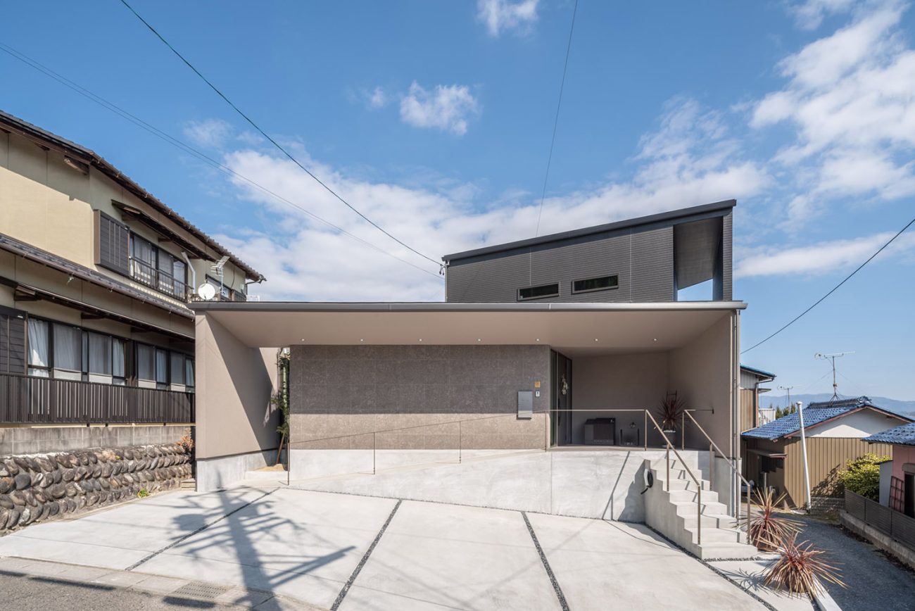 シンプルながらも奥行きのあるフォルムと、上品なグレーのグラデーションが街並みに映えるモダン住宅。外からの視線をコントロールしつつ、内部には驚くほどの開放感を持たせました。