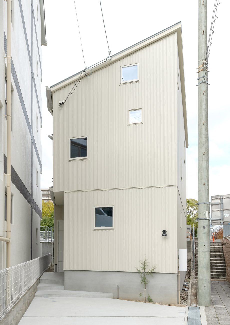 第一種低層住宅専用地域である閑静な住宅街に計画された、シンプルながらプライベート性の高い外観のお住まいです。
