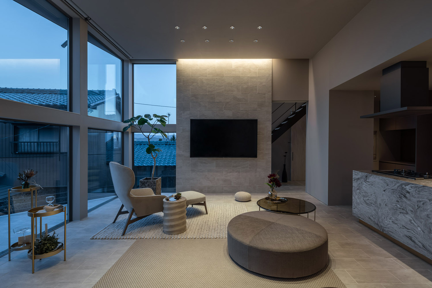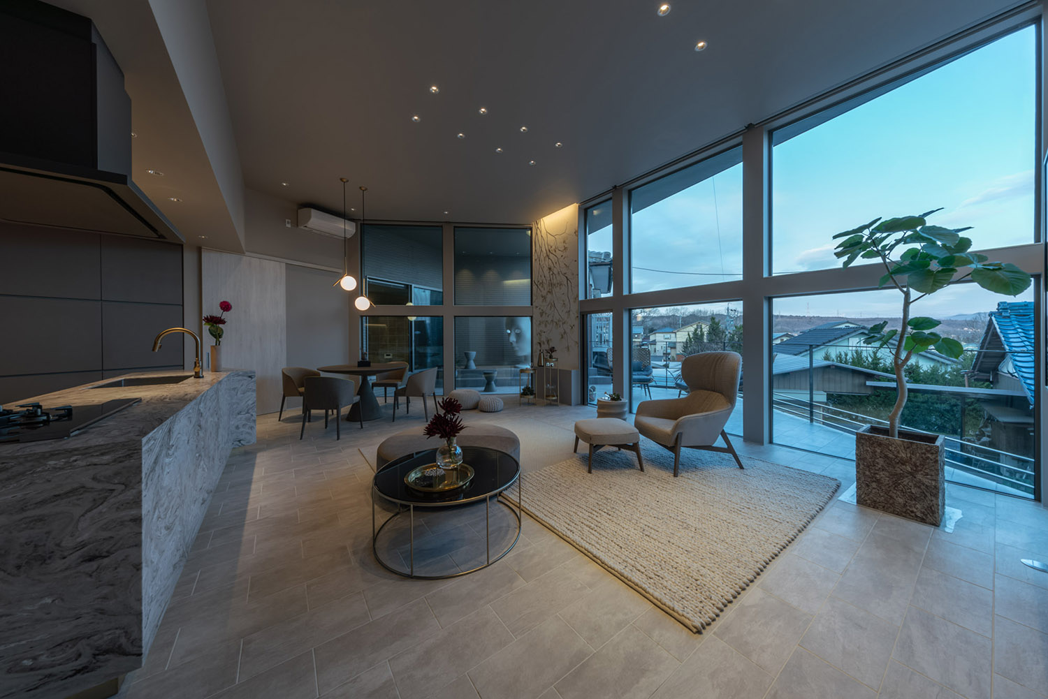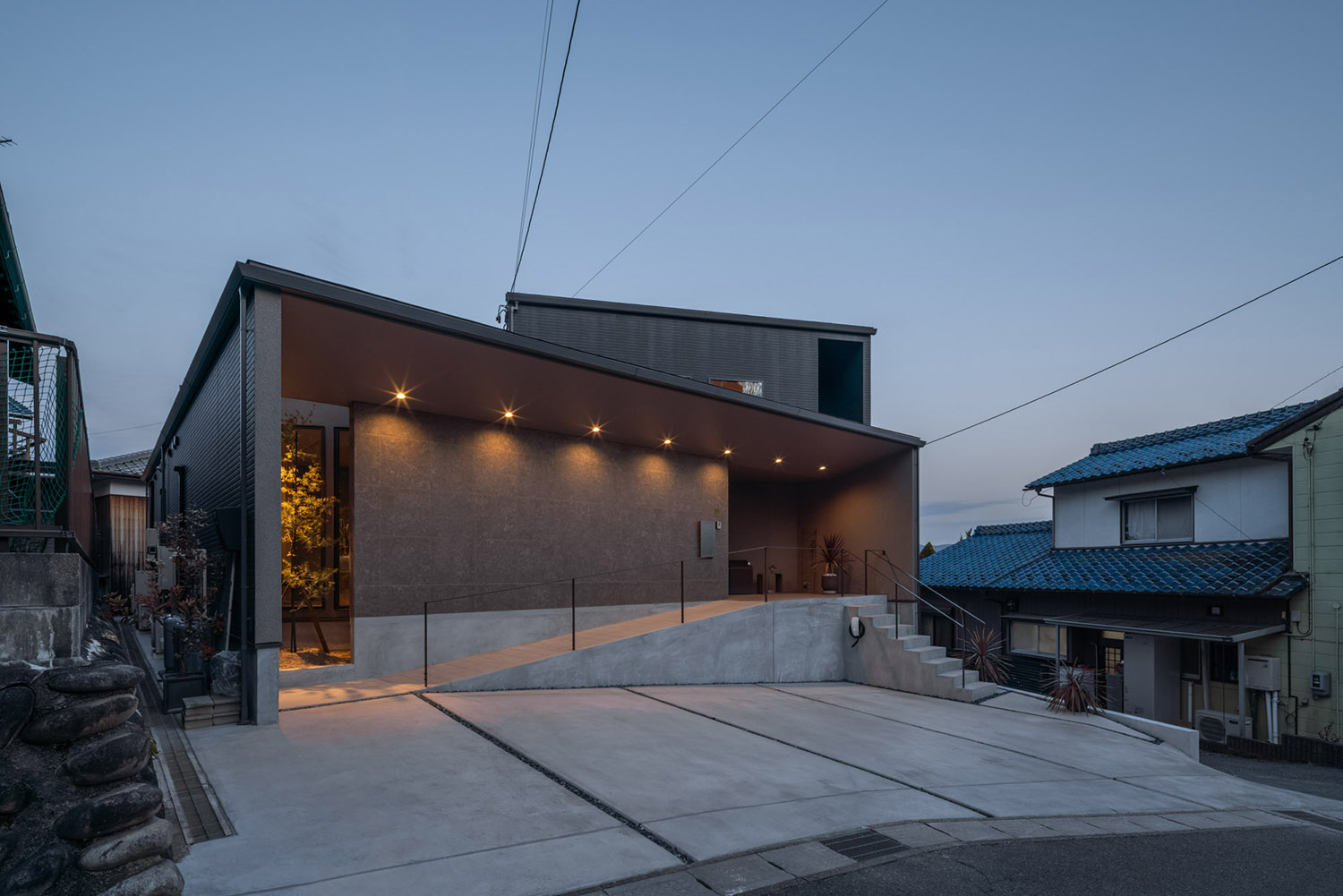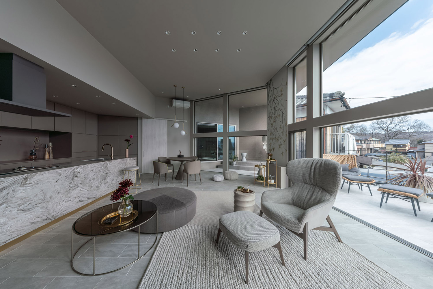 豊かな緑、空の広さ、高低差のある形状、風の道・自然の心地よさが表現されている土地を舞台にして、素晴らしいロケーションを活かすべく計画された住宅です。 建物は、ボリュームを「くの字」に曲げる事で、家の向きを決定付け、庭と建物の関係を整えています。5mの全開口となるサッシを開けると、庭と一体になるLDKが、「室内」としての装いから、自然の中に佇む「舞台」のような装いに代わります。断熱材や気密性能、地中蓄熱式暖房の採用にもこだわり、四季を楽しめるこだわりの空間を実現しました。