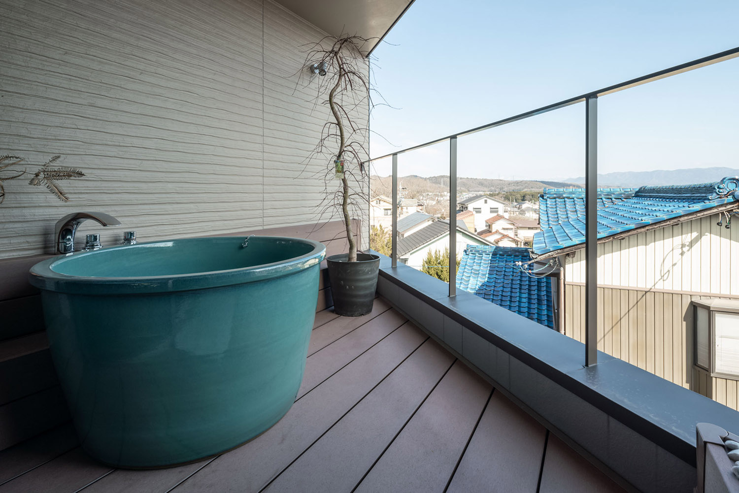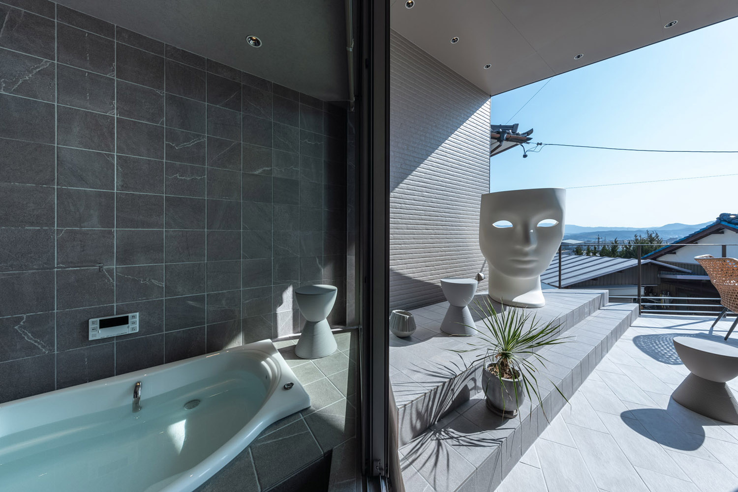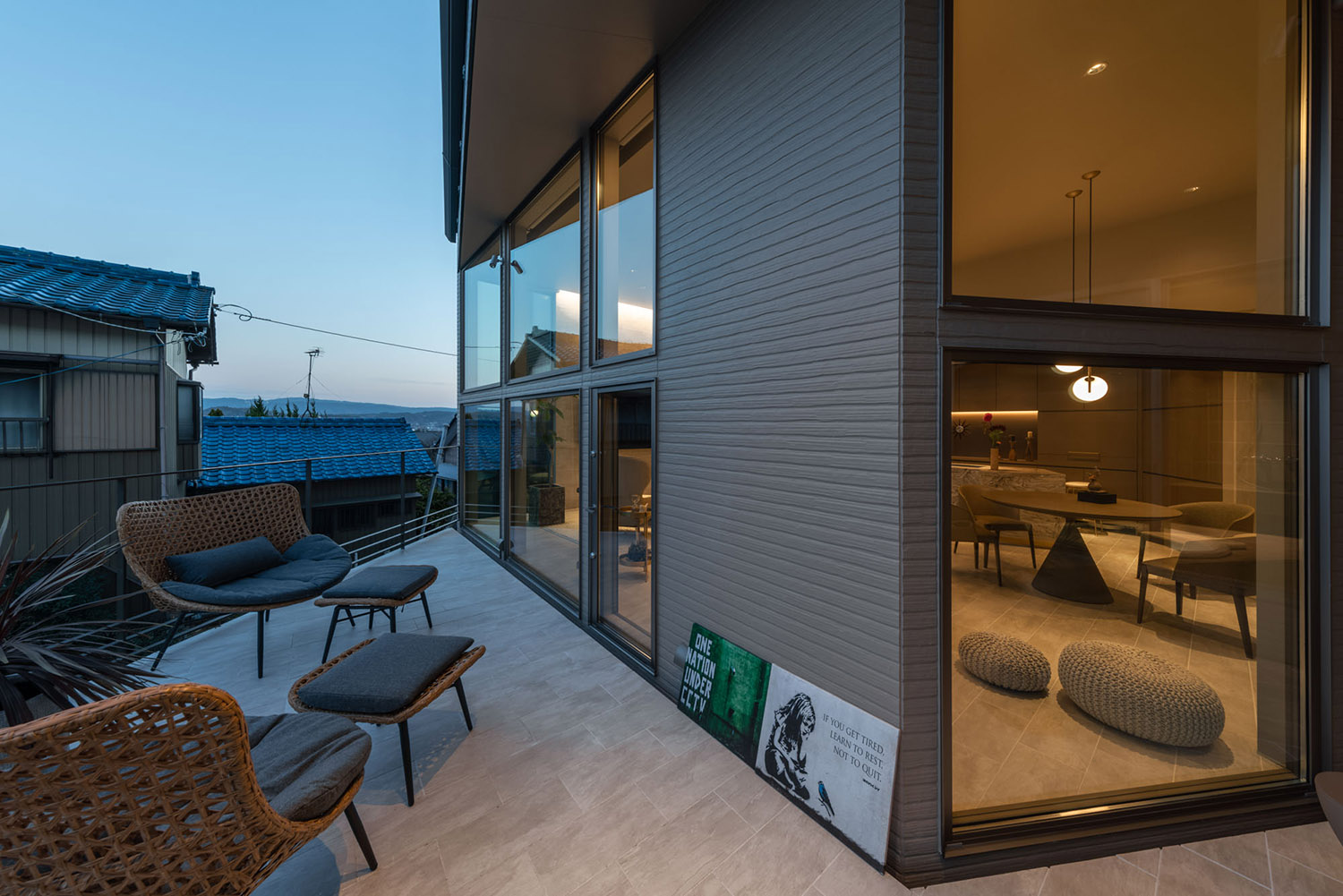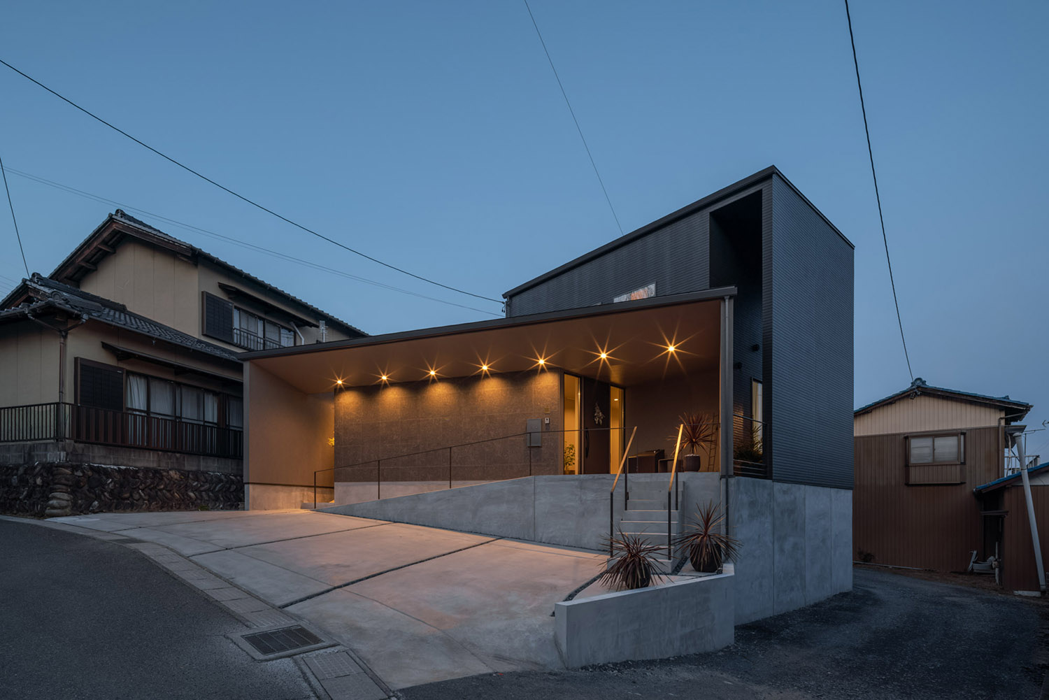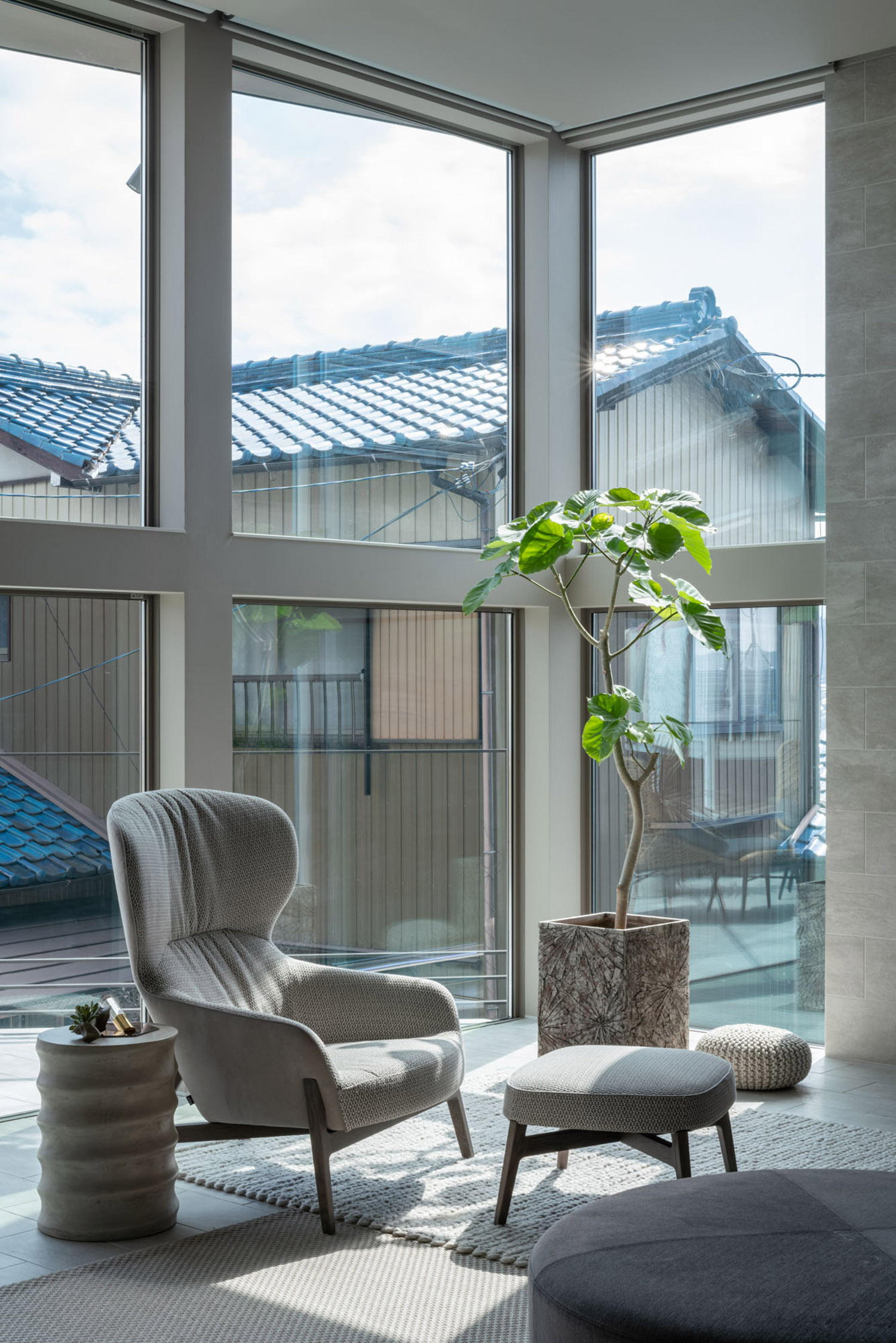 豊かな緑、空の広さ、高低差のある形状、風の道・自然の心地よさが表現されている土地を舞台にして、素晴らしいロケーションを活かすべく計画された住宅です。 建物は、ボリュームを「くの字」に曲げる事で、家の向きを決定付け、庭と建物の関係を整えています。5mの全開口となるサッシを開けると、庭と一体になるLDKが、「室内」としての装いから、自然の中に佇む「舞台」のような装いに代わります。断熱材や気密性能、地中蓄熱式暖房の採用にもこだわり、四季を楽しめるこだわりの空間を実現しました。