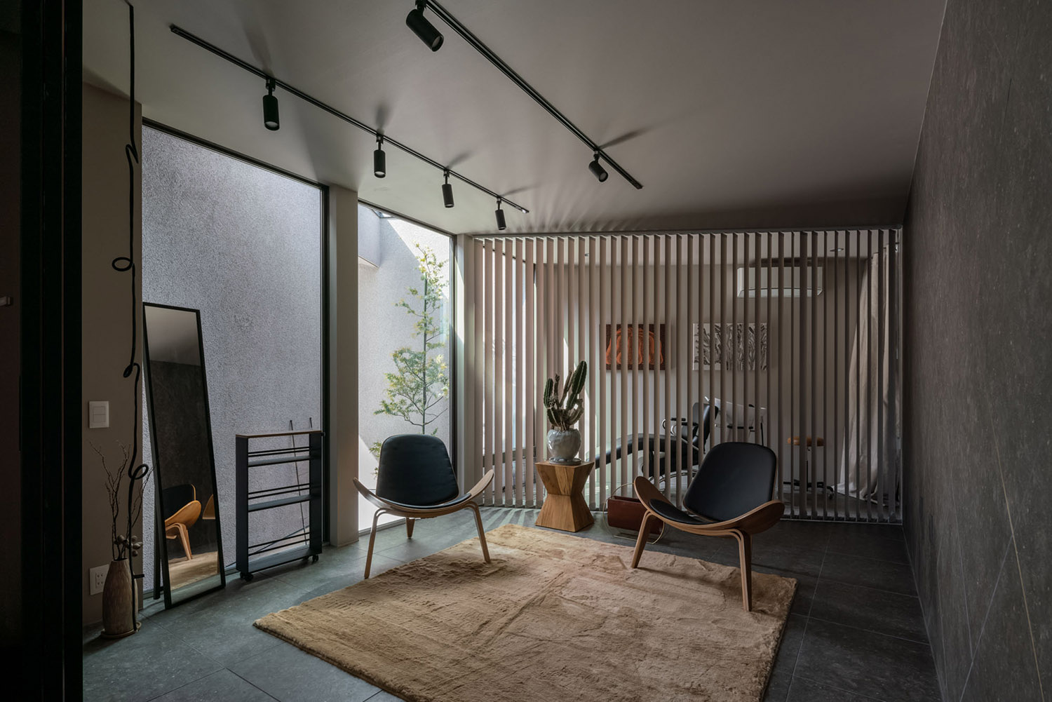 閑静な住宅地に計画された三角屋根の住宅。内部は、1階から2階までの階高を抑えることで、家族との距離感が近い空間設計に。さらに、屋根に沿った勾配天井にし空間の一体感を高め、ワンルームの様な開放感のある空間に仕上げています。リビングに面して設けた中庭は、床が続くようにデッキ材を設けることで内部の拡がりを高めています。また、外壁の一部に木製の開き戸を設け、街とやわらかく繋がる工夫もしています。