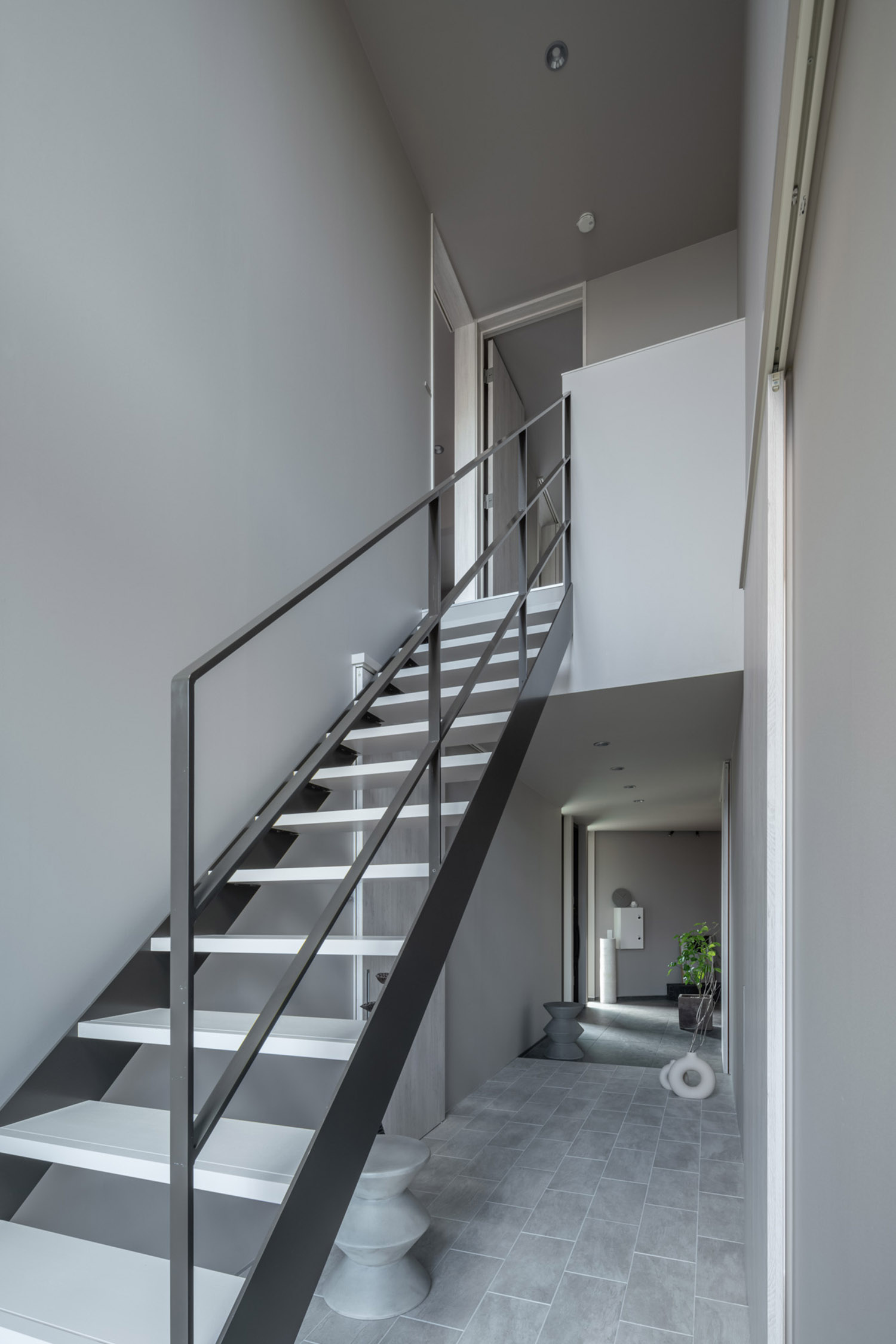 高低差が大きい立地を生かして、間取りを設計。交通量の多い道路側は極力ふさぎ、シンプルな外観でプライベート性を高めたデザインで仕上げています。内部では、プライベート空間とお客様を迎えいれるLDK/玄関ホールに分け、2つの棟を階段で繋いだ造りに。ライトコート・階段ホール・テラスをうまく配置することでプライベートを確保しつつも、開放的で明るいLDKを実現しています。来客時でも、気兼ねすることなくゆったりと寛げる住まいになりました。