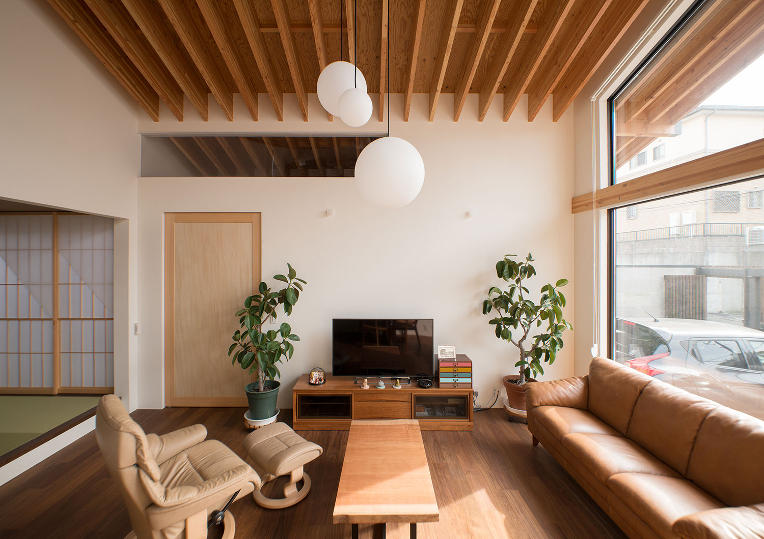 玄関から連続する垂木によって構成された住宅。 構造を可能な限りそのままの形で設けることで、居住空間に自然と馴染む構造美を創出しました。建物の南側には大きな開口部を設けて、LDKに目一杯の採光を取り入れています。合わせて、外部からの視線を遮るために、道路側にはルーバーを設置。プライバシーを確保しつつ、リビングから外を見た際に、圧迫感のない広がりのある空間を実現しました。