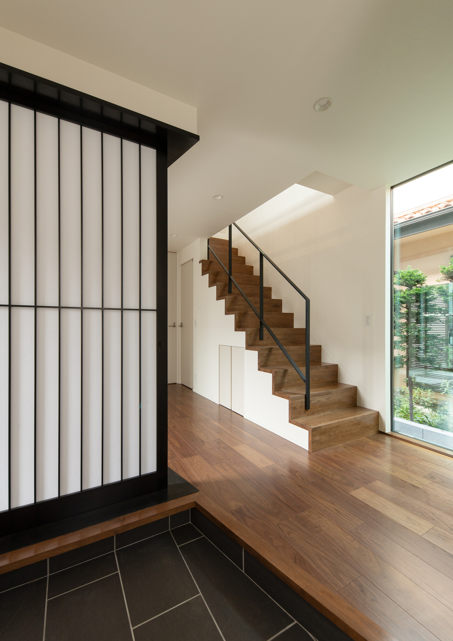 タイル張りの玄関の正面には黒枠の障子が目に入り、和モダンな印象となります。